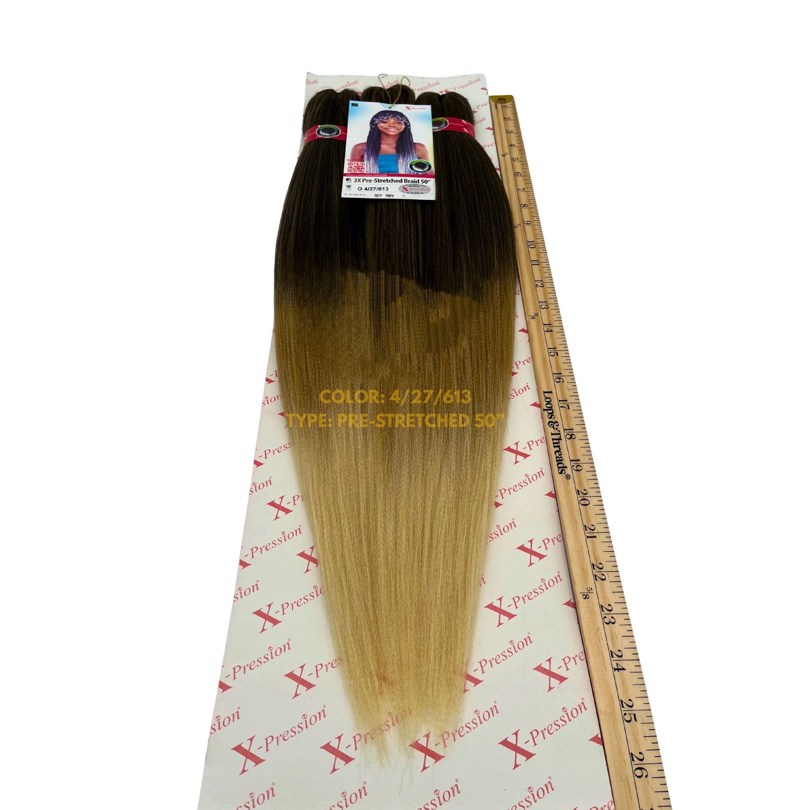 Our X-Pression 3X Pre-Stretched Braiding Hair in Color 4/27/613 blends medium brown, honey blonde, and platinum blonde for a beautifully dimensional, multi-tone braid look. Each pack includes 3 bundles of soft, lightweight, pre-stretched braiding hair that make installation faster and smoother with minimal tangling. Perfect for knotless braids, box braids, feed-ins, and cornrows that showcase a warm-to-bright color blend with a natural flow.